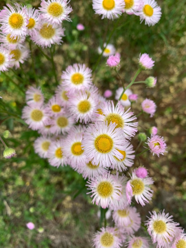 There are little lavender Fleabane daisies that are edible bouquets to wild rabbits